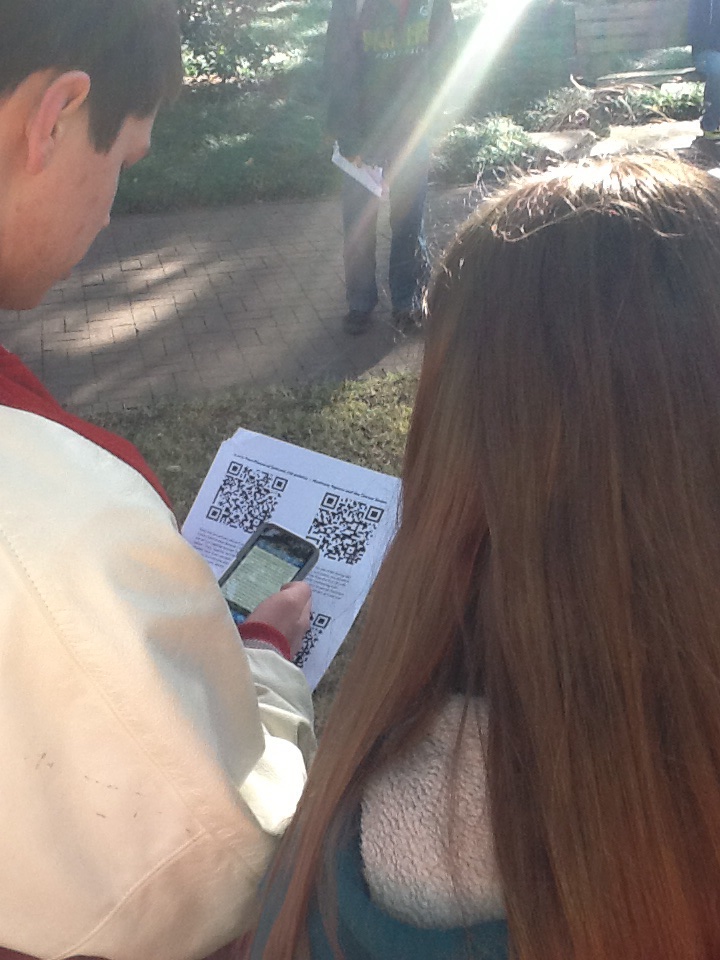 QR codes are also great tools to use on special occasions.  I teach AP Language which naturally pairs itself with AP U.S. History.  My school is also fortunate to be close to downtown Historic Savannah, so our APUSH teacher and myself decided to plan a field trip to downtown Savannah so that our students could have some true historical research field experience.  I was super stoked about the field trip, but when I told my students we were going to downtown Savannah they did not have that same feeling of elation that I had hoped for…instead I heard some whining and grumbling that they had already learned everything there was to learn about Savannah on previous field trips from earlier grade levels.  So, I promised “something different” and “something new.”  After a lot of research and testing, I came up with an idea for an Amazing Race style trip through Savannah that relied on QR codes.  Students were placed in heterogenous groups of four that allowed for some student choice.  Each group of four had their own chaperone; we had a total of eight groups.  We came up with various activities that students could complete at different places around downtown Savannah.  The learning activities all tied back to an AP Lang or APUSH standard.  For example, at Franklin Square in Savannah students had to use the QR codes to access websites to read about the history of Franklin Square.  Then, they had to use a QR code to read an excerpt from Franklin’s Autobiography.  After reading the history of Ben Franklin in Savannah and performing a close read on the selection of his Autobiography, students then had to conduct and film a Socratic discussion about the history and passage excerpt all while visiting the square named for Benjamin Franklin.  We designed many activities that used historical Savannah along with QR codes, research, and standards.  We planned for our students to learn about the real history of Savannah and the rhetoric that helped create that history.