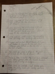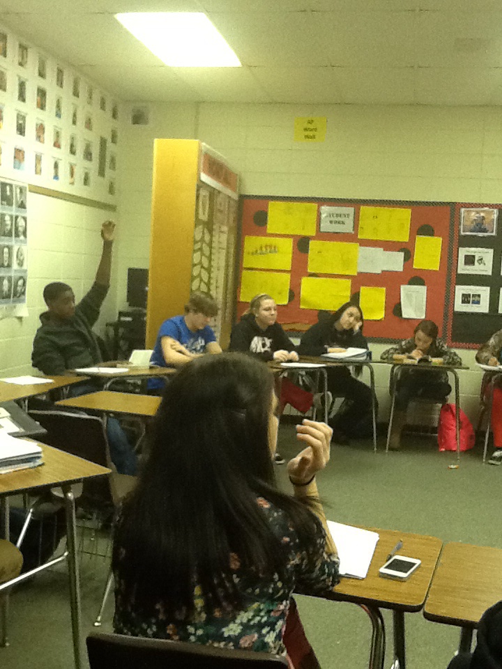 After assessing questions, we set up the room into one giant circle — I usually wind up sitting outside of the circle because my classes are large (and it also helps students to focus on each other and not on me). I encourage students to use their books and materials during the seminar. We also talk about how to respond during the seminar. I require five total verbal responses with at least two pieces of textual support. At first, textual support is just references to specific events or spots in the text, but later it becomes actual reading of certain parts of the work with page number. Sometimes I show videos of Socratic Seminars from previous classes so that students have a better idea of what to expect. We always have a talk about classroom decorum (head up, eyes alert, mind engaged) and what behaviors will earn deductions in a student’s grade (cell phone use, blurting, movement, distracting behaviors).