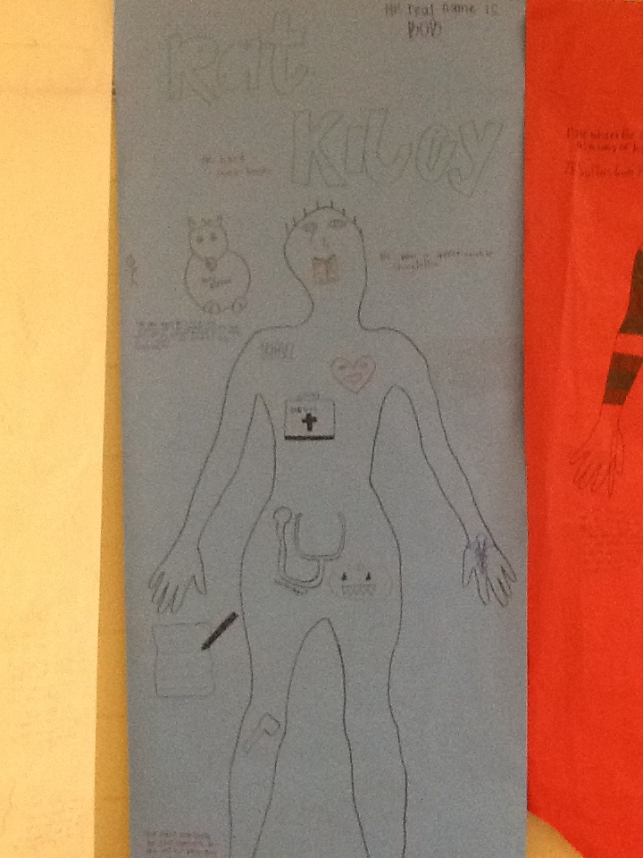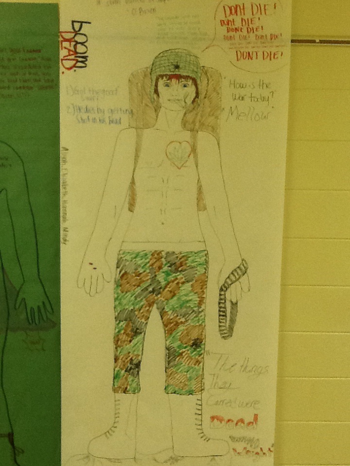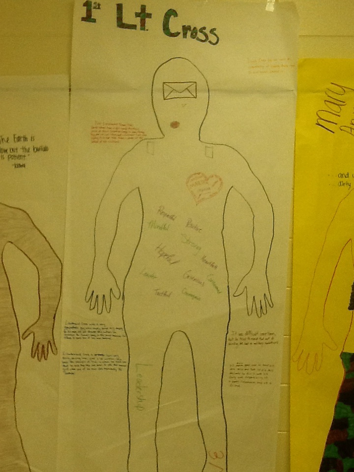 This is how it works. Every group of three to four students receives (or chooses) a character from an extended text the class is reading (a play or novel works best). One student lies on top of a piece of butcher paper or chart paper. Another student traces the living model — this is why you may want to use same sex groups. After the team has traced their model, they then put their character’s name at the top. They use colors, symbols, and physical traits to decorate and represent their character. They must include textual support (strategically placed) with a citation to further analyze their character. They also need to think about how and when their character emerges and changes throughout the text as well as that character’s relationships, motivations, and interactions with people in the text. I always give each group an assignment sheet as to what they must consider and include on their body biography. Instructions are tiered to fit learner profiles.