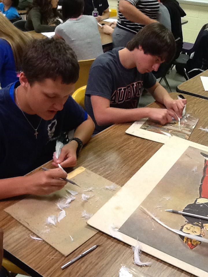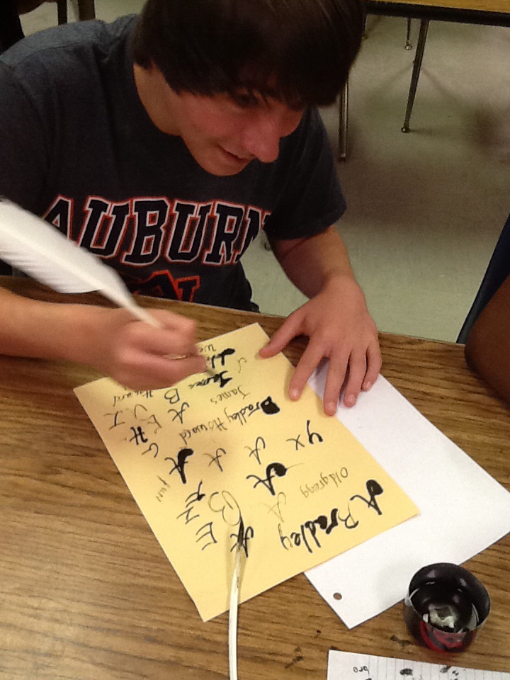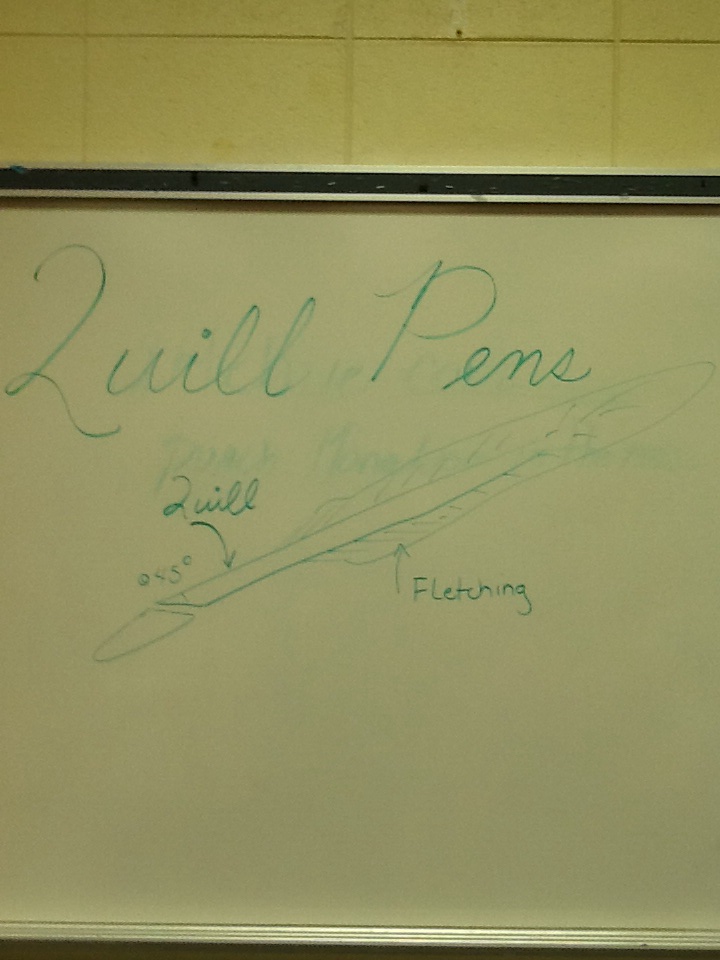 Two weeks ago, I walked in on Mrs. Safley teaching students in her art class about quill pens. She taught them how to make their own quill using feathers recently harvested from a turkey. As she worked with a small group, the students learned how quills were made, how words were written, and how the alphabet developed from this “technology.” I was mesmerized. The wheels began to turn as I began to think about how much this lesson connected to Shakespeare. A writer from his time period was not like today’s writer who easily creates new product using the latest technology; Shakespeare and others labored for their art. They practiced writing. They drafted and drafted their work. They watched one ink blot damage a whole page of their draft, yet they persevered. I thought there was a great lesson to be learned here.