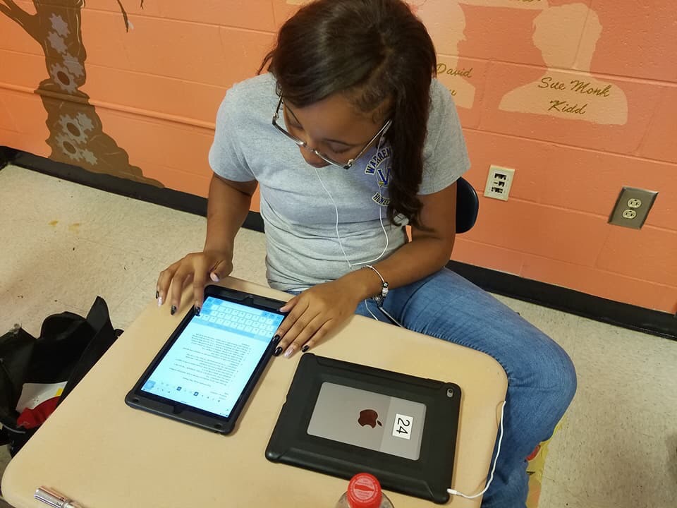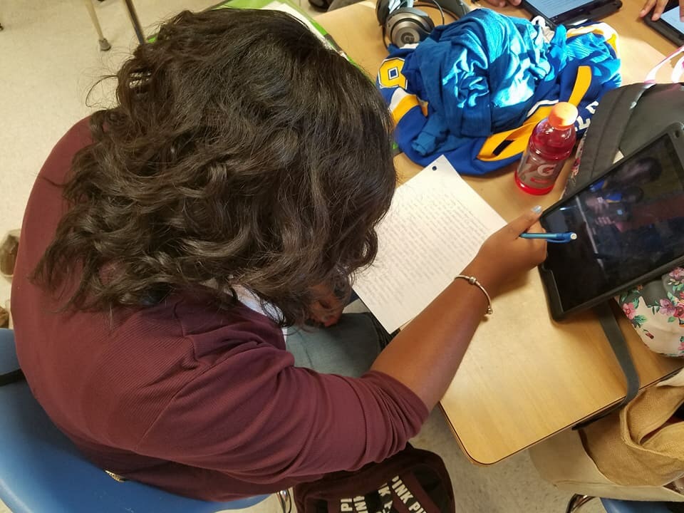 As you can see, each student is on a different task. Kendall (left) is working on his Lexile program Achieve 3000. Jordan (center) is working on a vocabulary study tool. Deangelo (right) is working on an argumentative essay while listening to music. Kendall and Jordan are listening to the music playing in the classroom because they requested Michael Jackson be played.