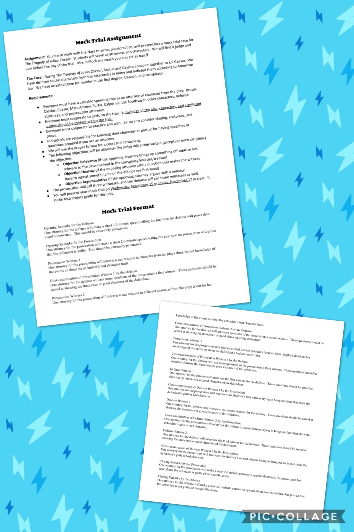 I have a standard mock trial assignment template sheet that I made, which includes the format for a trial and the types of objections allowed. You can add or detract types of objections based on the level of students you teach. I take less than ten minutes the day before introducing the mock trial assignment to modify the assignment sheet and post it to Google Classroom (or you can make copies). The next day I take ten minutes to find judges and juries. That is all the prep time I need. Everything else is done during class. I have other teachers and classes serve as judge and juries.