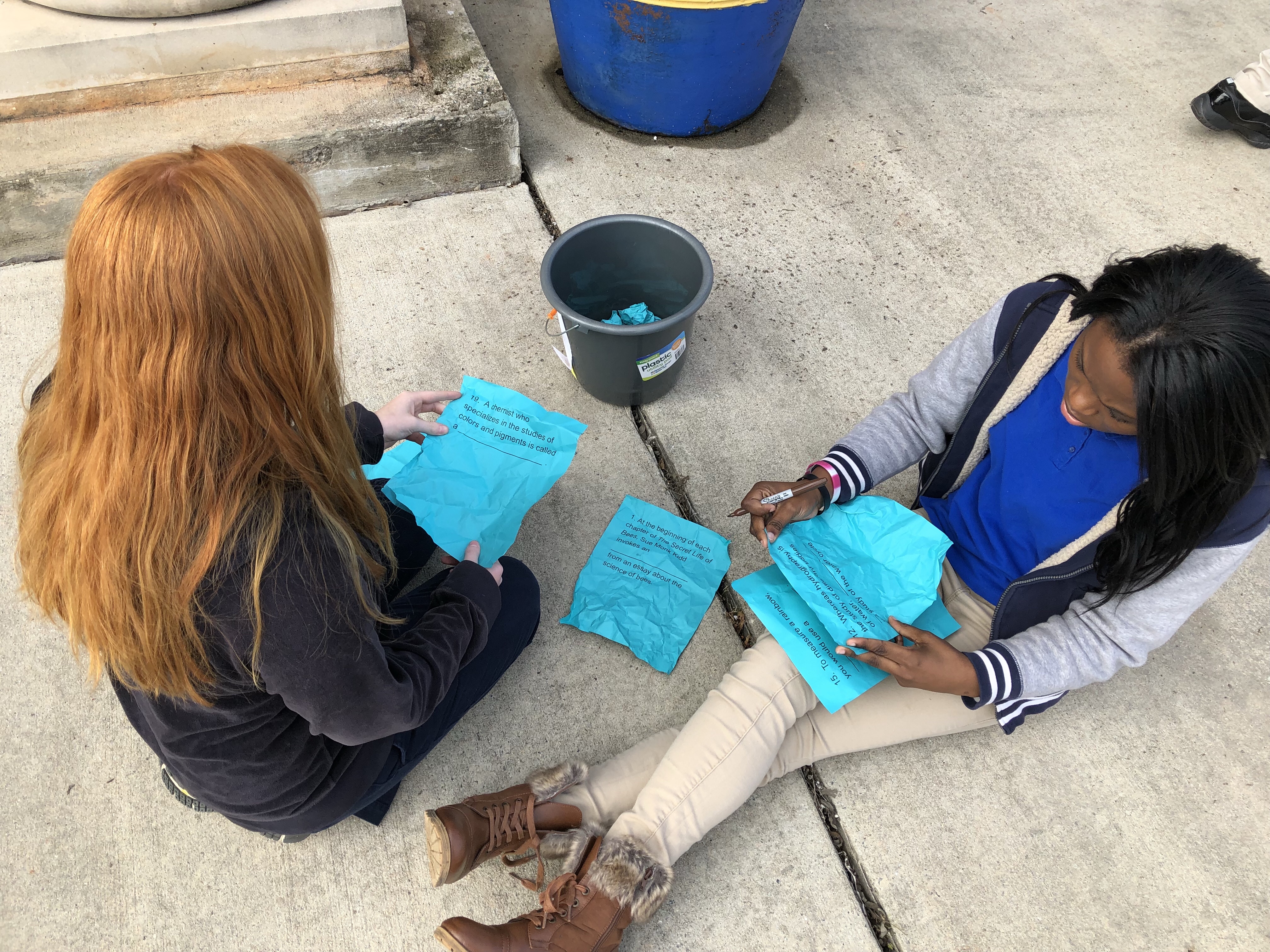 Put one clue per sheet of paper. I usually split my class in two teams, so I do two different colors, one for each team, meaning I just hit the print button twice using two different colors of paper. In a bigger class, I would make more groups and have more colors (one color per group). Ball each clue up into a small ball. Hide them like Easter eggs all over the place. I like to do my Vocabulary Egg Hunts in the front of the school with the clues hidden everywhere outside. To save some time, you can have students in a different class help you hide the clues.
