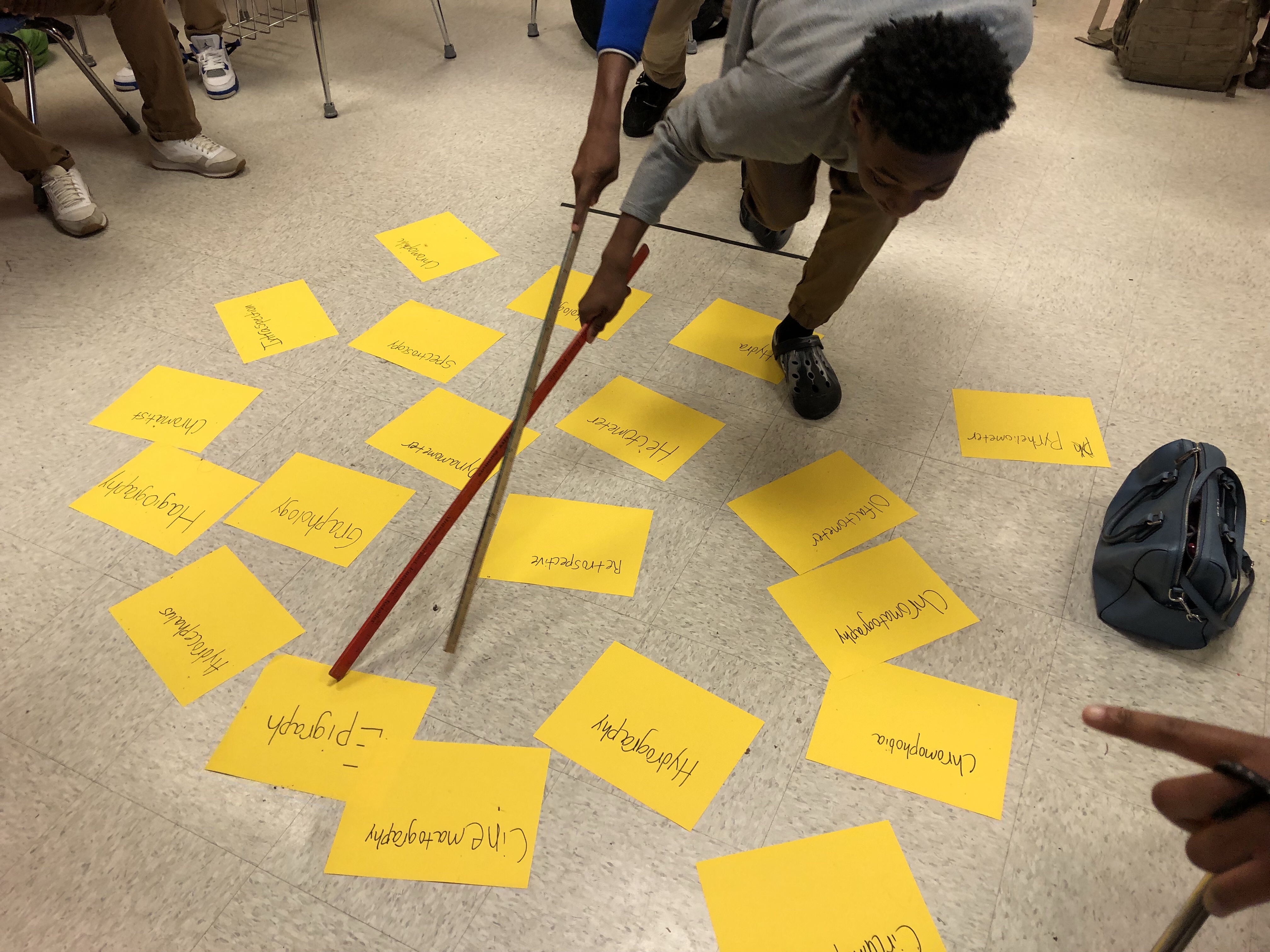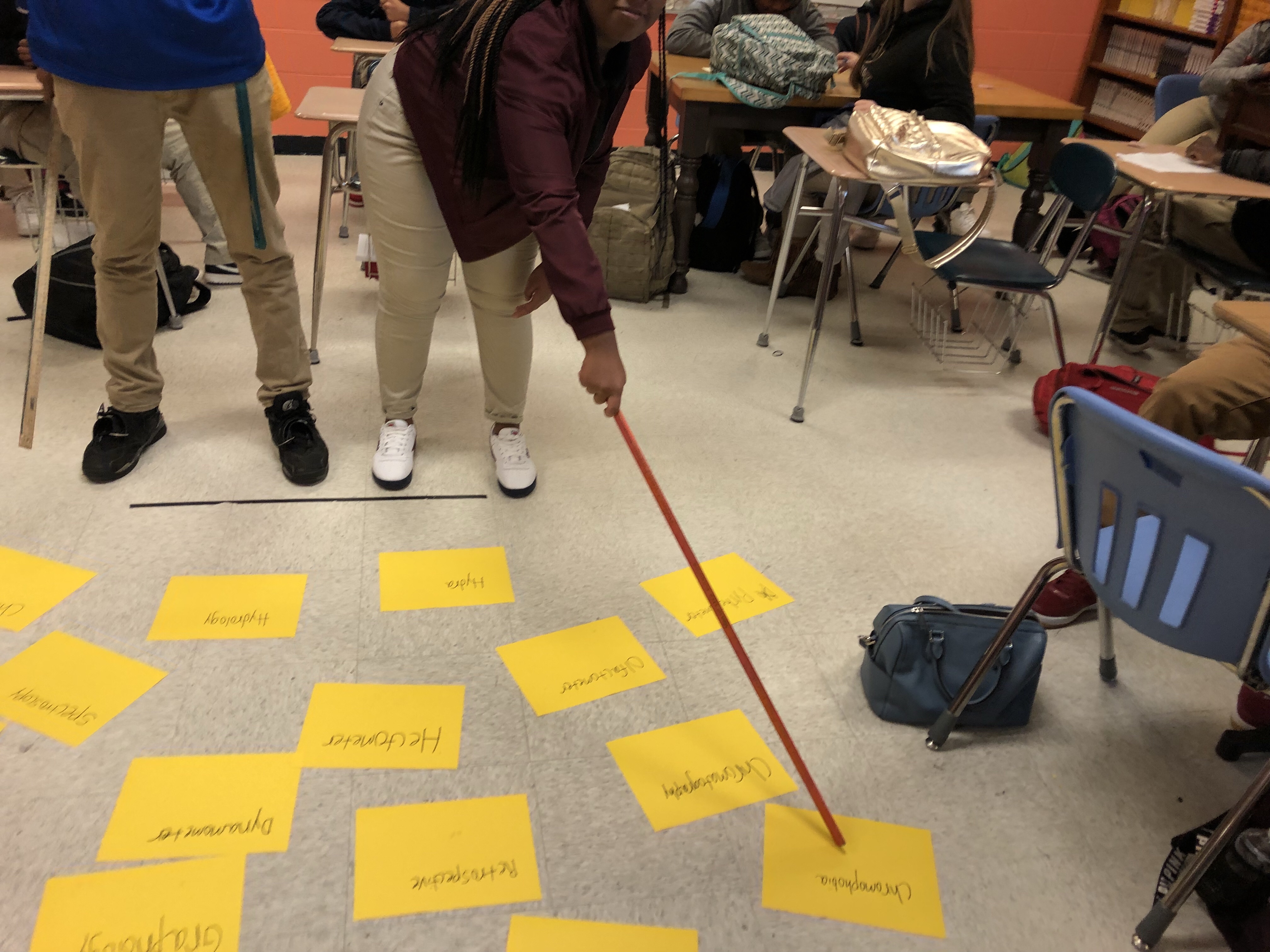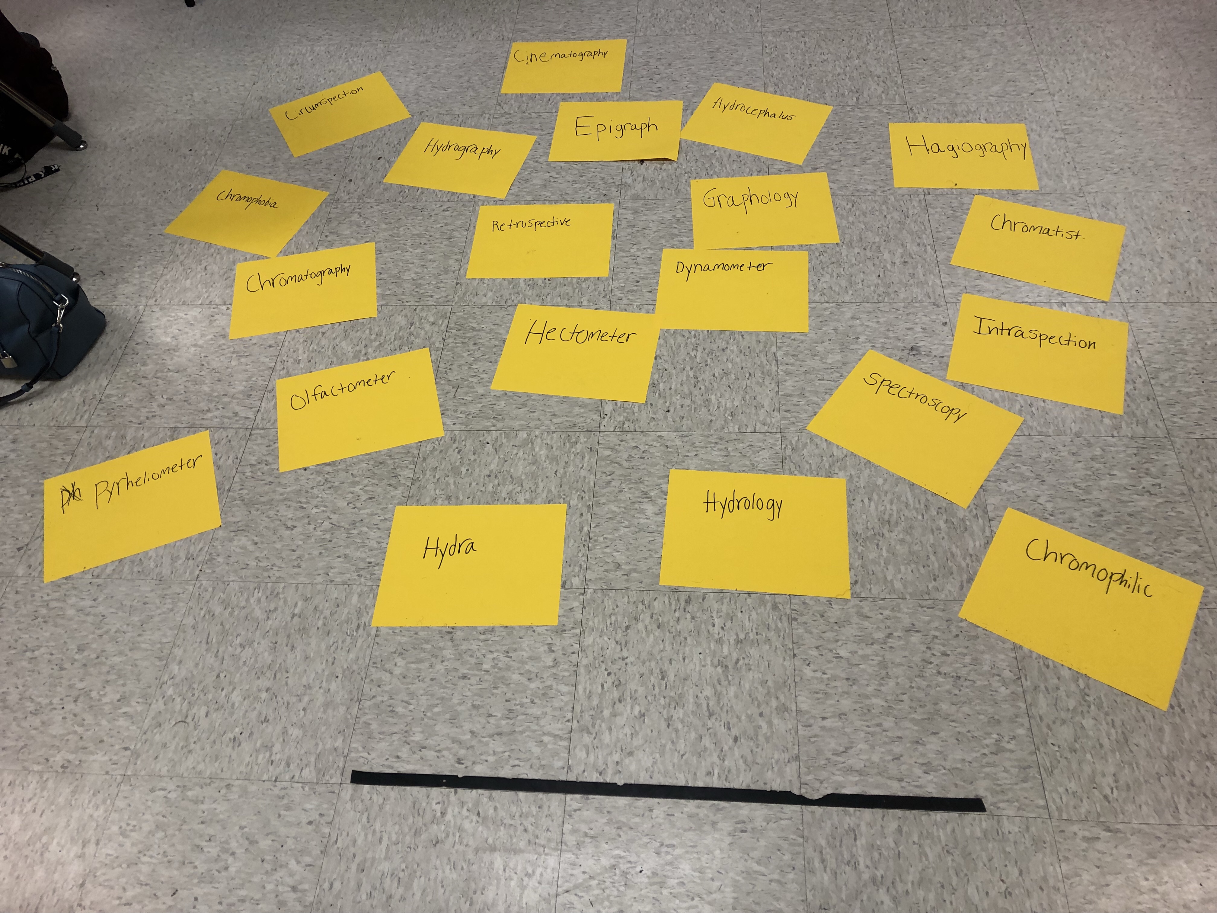 To prepare for this game, you just need some review questions or practice test questions for concepts that can simply be selected. This could be vocabulary words, historical dates, ellipses graphs, Spanish words, anything! You write one word or answer on each sheet of colored paper, and then lay them flat in a random order. I also use my game line, where students must stand behind.