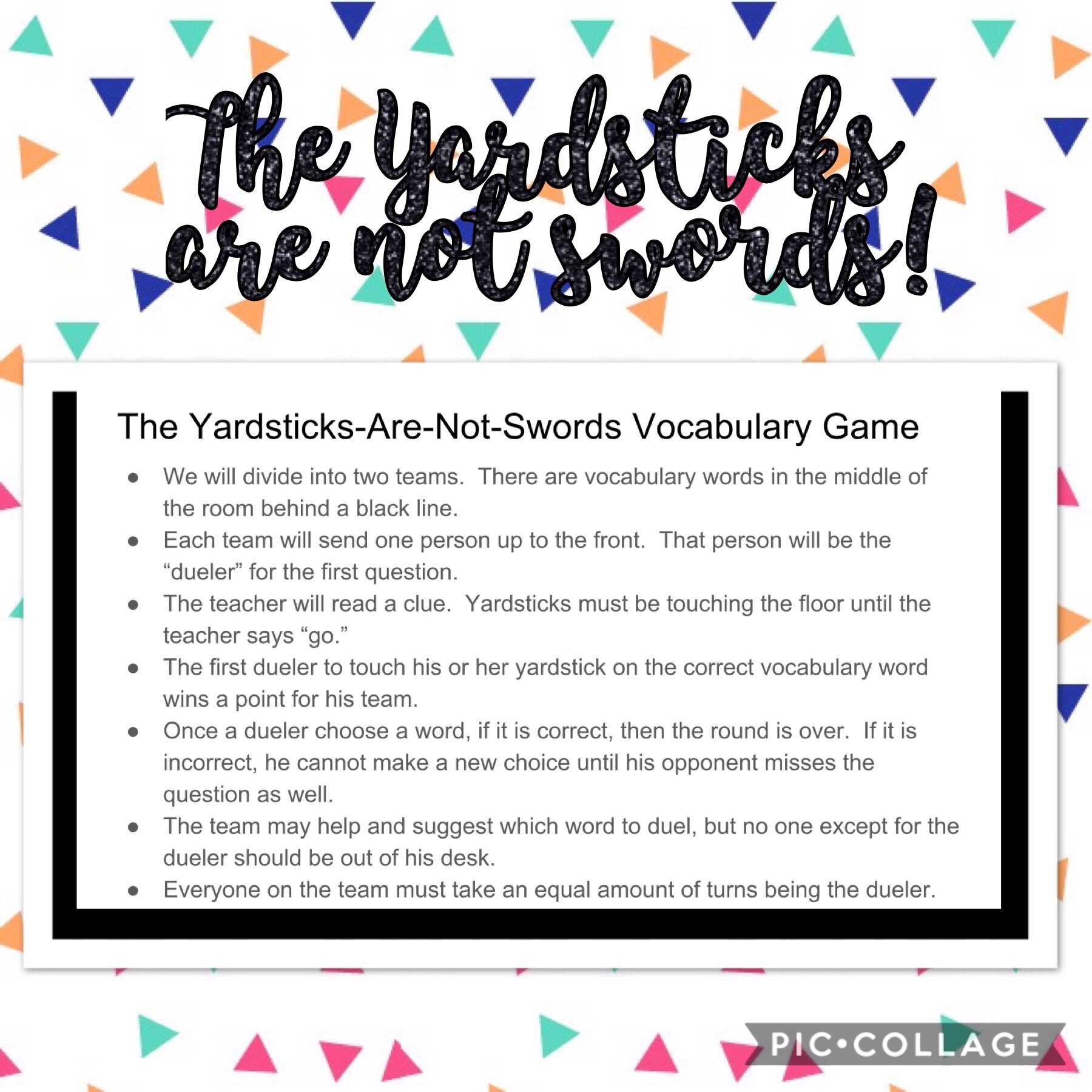 To play the game, divide the class into two large groups, and have each team send up one “dueler.” The yardstick-is-not-a-sword must remain tip down on the floor until the clue has been read and the teacher says the magic word “go.”