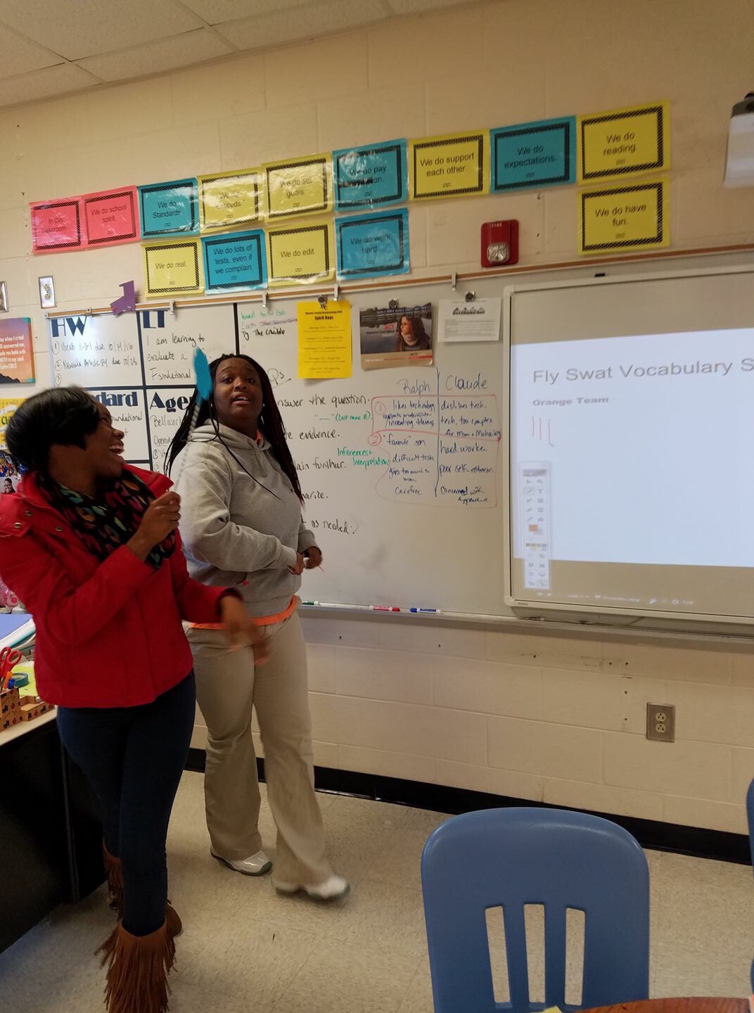 After the game is prepped, you should form two teams (I use playing cards or houses, but you can do it any way you want). The teams will each send one Swatter forward at a time. My swatters stand on the game line I made on my classroom floor with electrical tape while I am reading the clue. Once I read the clue, I say “go!” and the students compete to see whose fly swatter will touch the correct answer first.